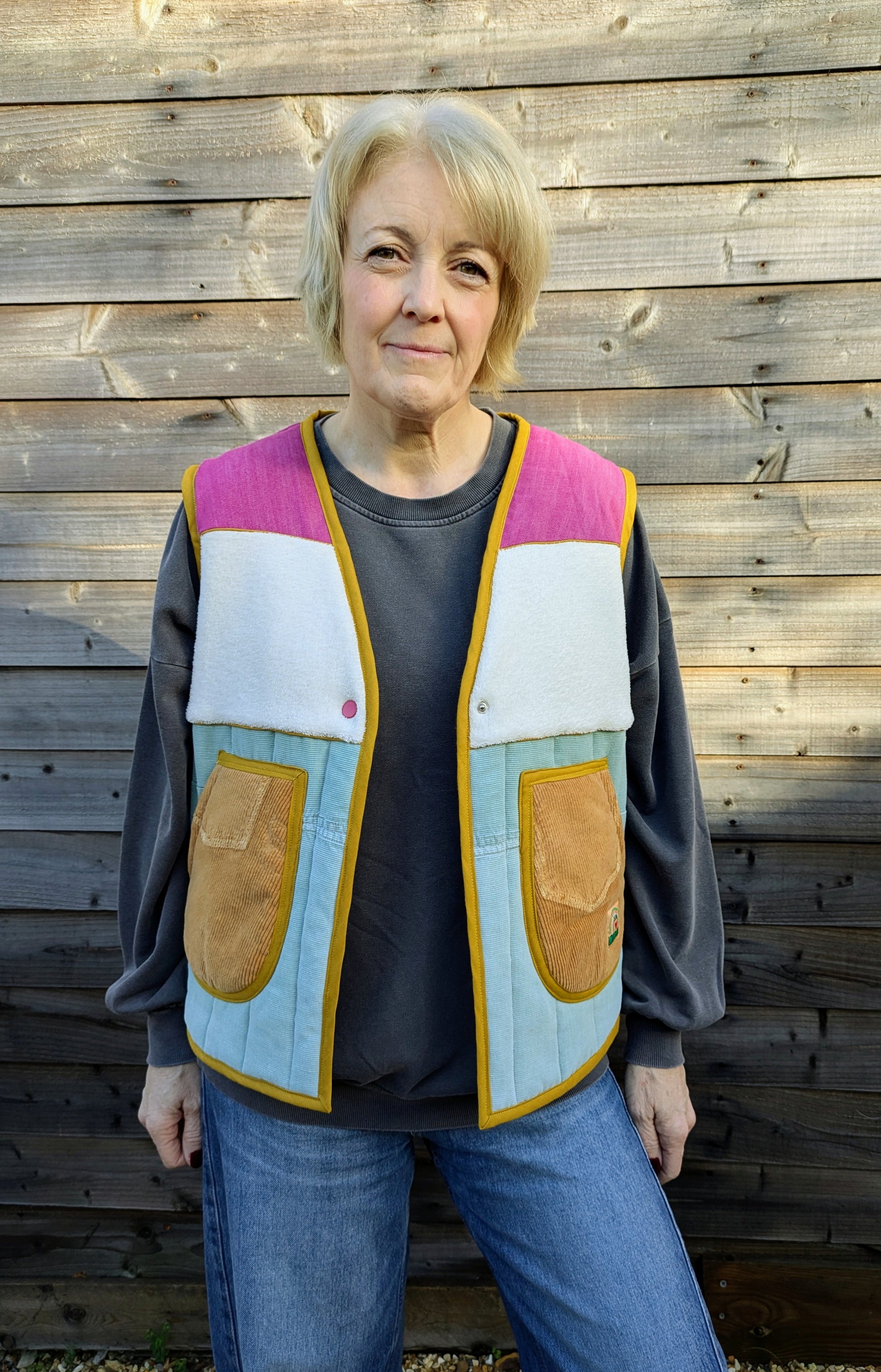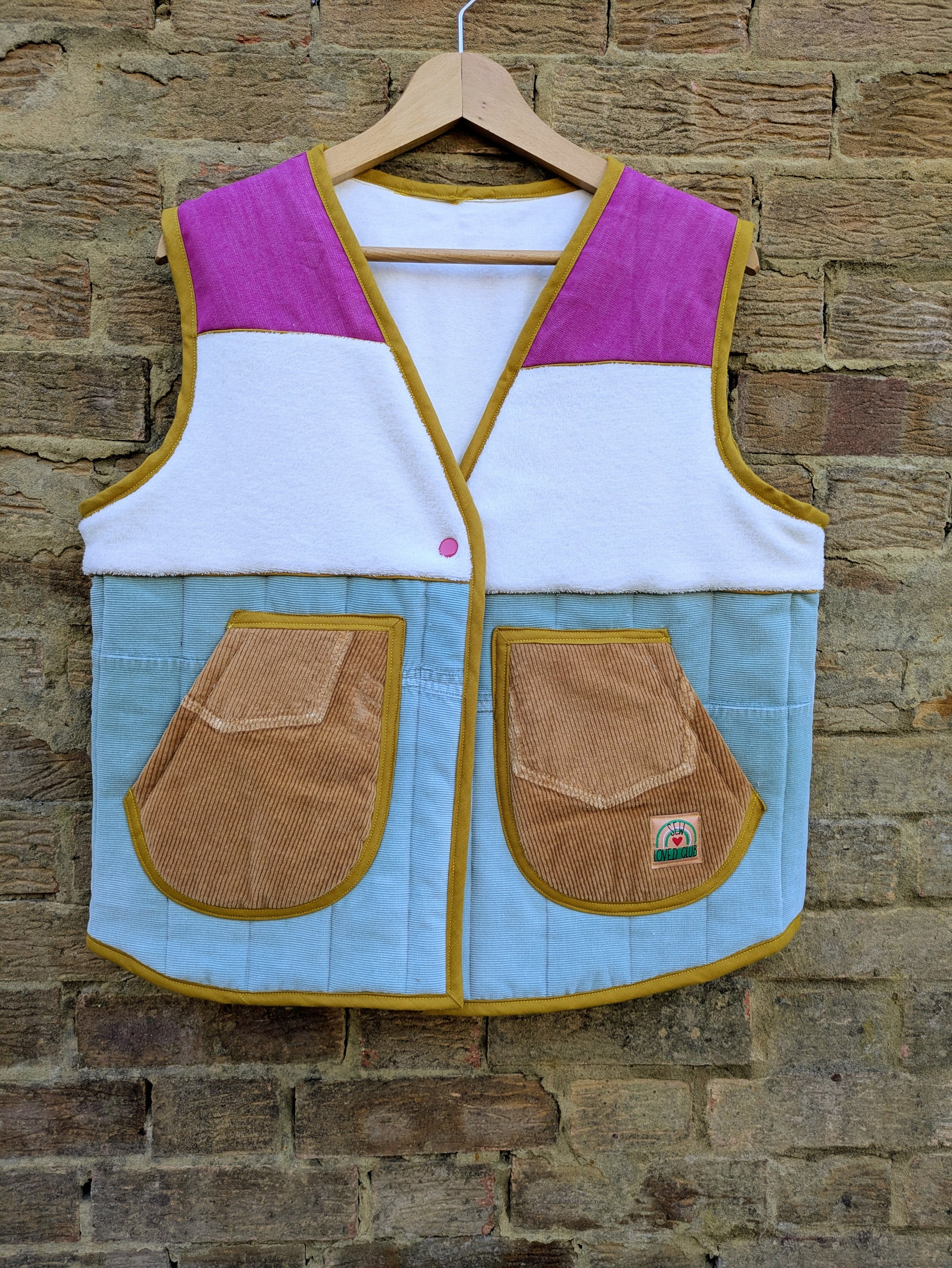 This lovely bright padded gilet will keep you nice and warm. Handmade with fleece from an unwanted blanket, mixed with cotton drill from a repurposed pair of jeans, quilted fabric from second hand trousers and, lined with a brush cotton vintage sheet. The pockets are made from the pocket area of some second hand cord trousers. Its been finished off with mustard yellow binding and a bright pink popper fastening. This is a complete one off and will add a pop of colour to your wardrobe.