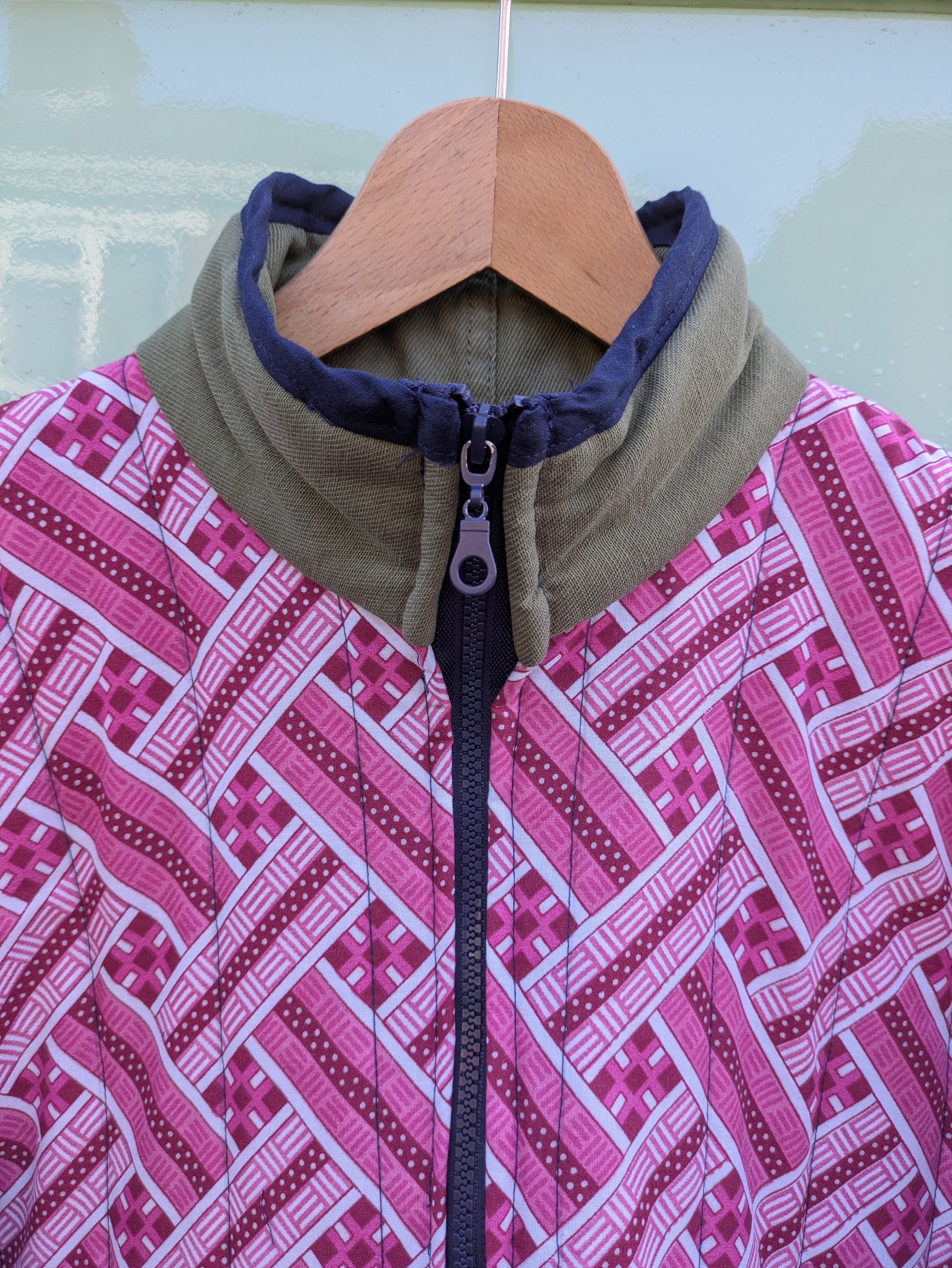 Lovely quilted jacket made by repurposing a vintage sheet, an unloved skirt and a pair of denim and corduroy jeans plus a vintage curtain as lining. It has two large statement pockets and is finished off with a nice chunky zip.
